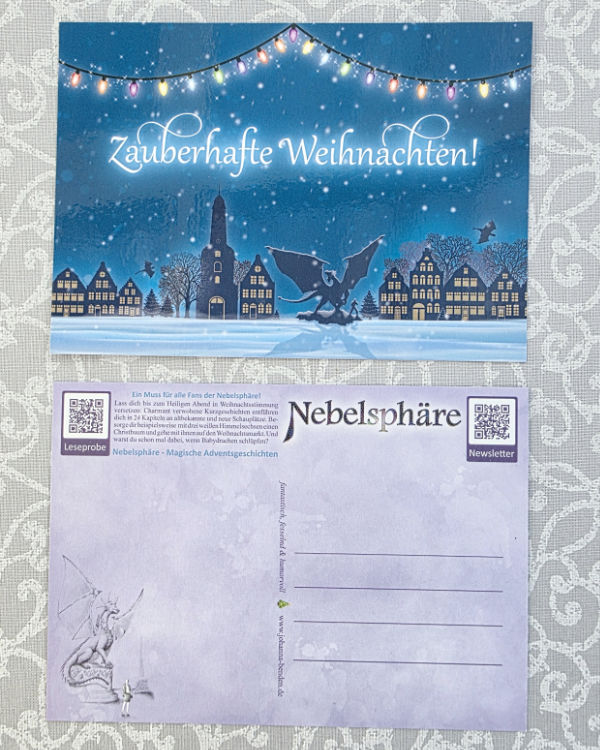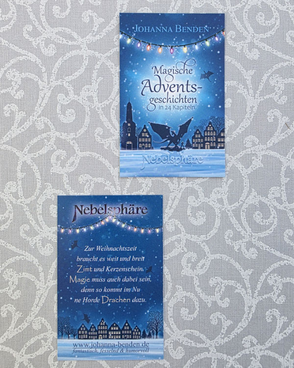 Natürlich kann die private Edition der Adventsgeschichten nicht ohne Tüdelkram mein Haus verlassen. 😁 Diesmal bekommt ihr eine weihnachtliche Postkarte von mir und auf der Rückseite des Lesezeichens findet ihr ein Adventsgedicht, das meine Tochter verfasst hat. 😍 Eines meiner Crew-Mädels hat vorgeschlagen, dass ich das bei der Buchausgabeparty vor dem Eintritt bei meinen Gästen abfragen sollte. 🫢 Hmm – die Idee gefällt mir immer besser, oder bin ich jetzt zu fies? 🤔🤣